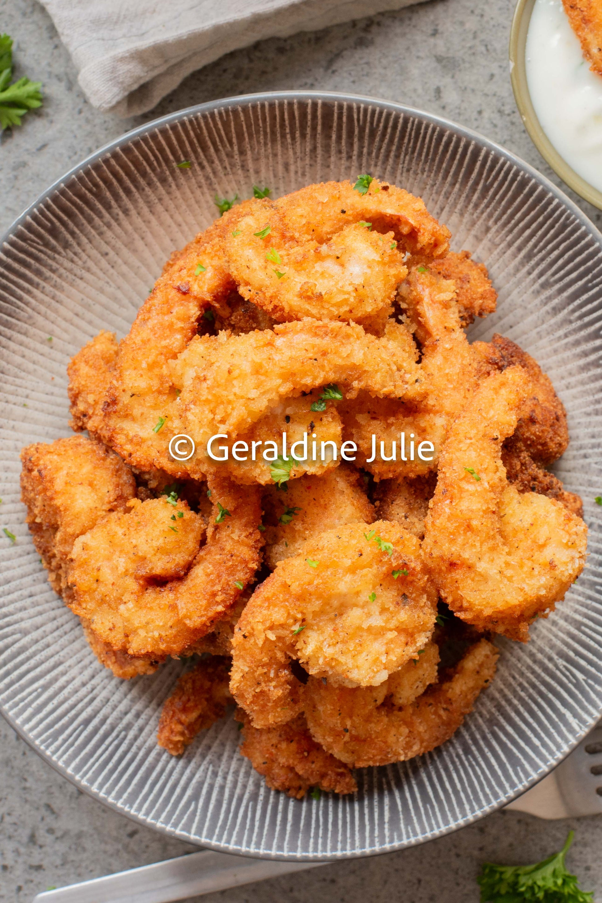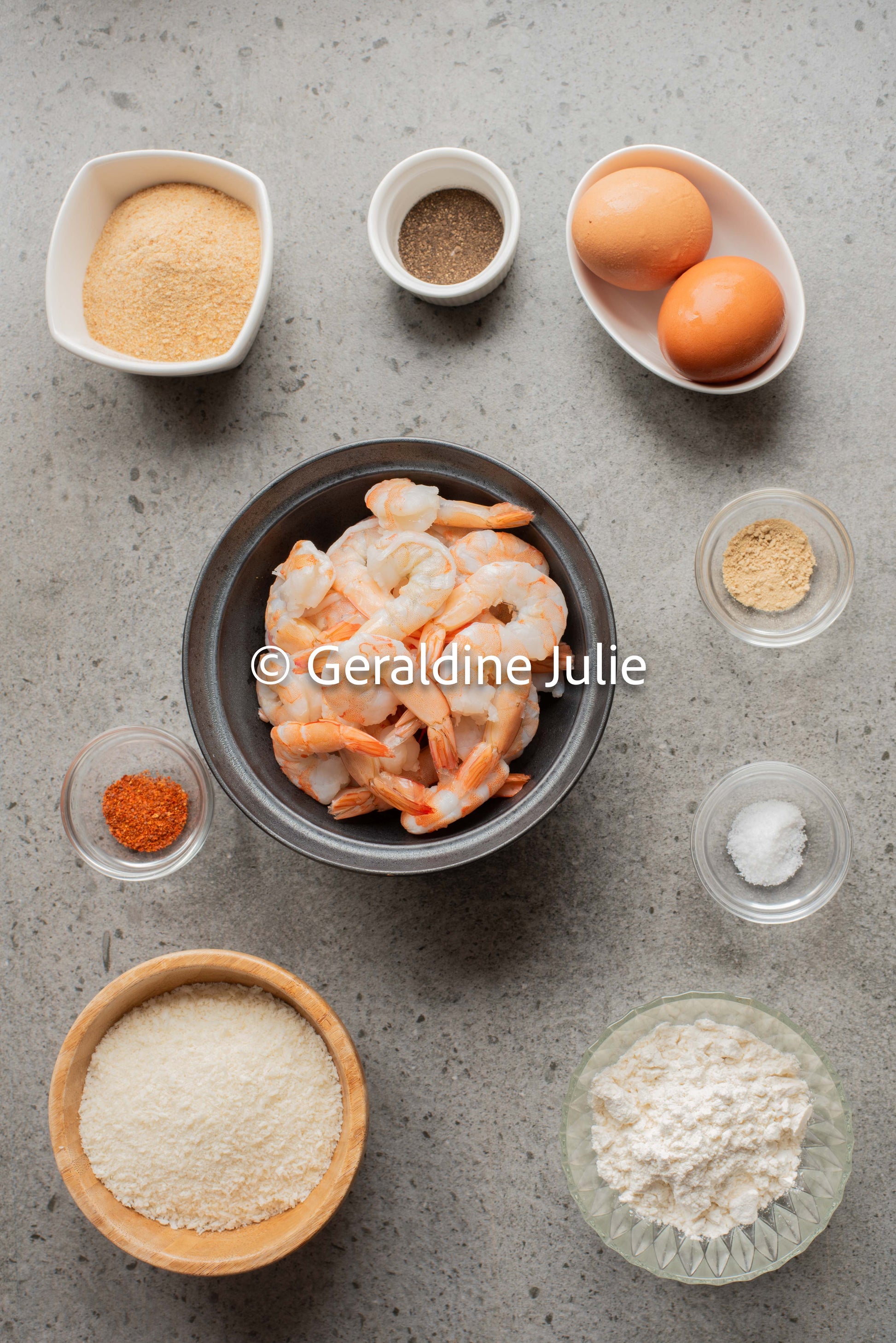 🧄 Ingredients include: Shrimp, flour, egg, panko breadcrumbs, regular breadcrumbs, paprika, garlic powder, salt, black pepper.