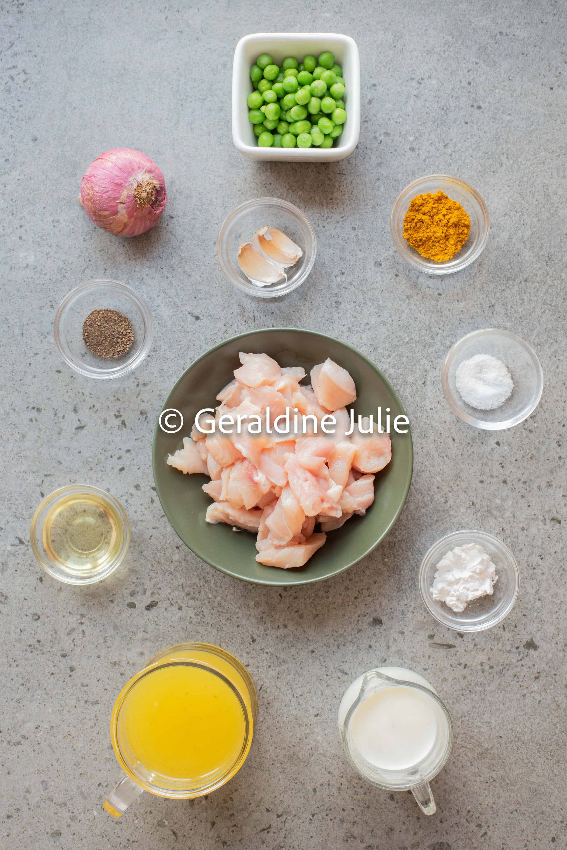 🧄 Ingredients include: Chicken, oil, onion, garlic, curry powder, cornstarch, chicken broth, coconut milk, green peas, salt, pepper.