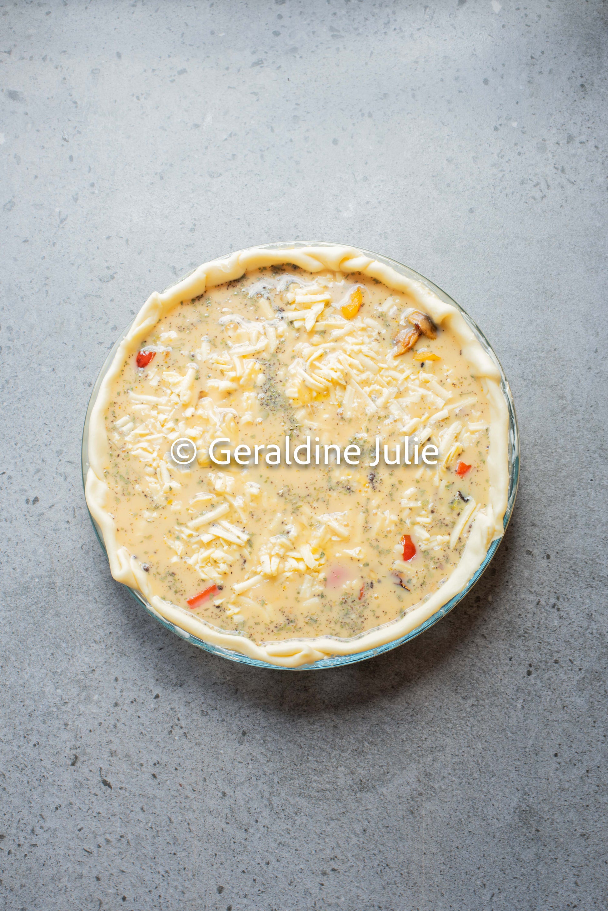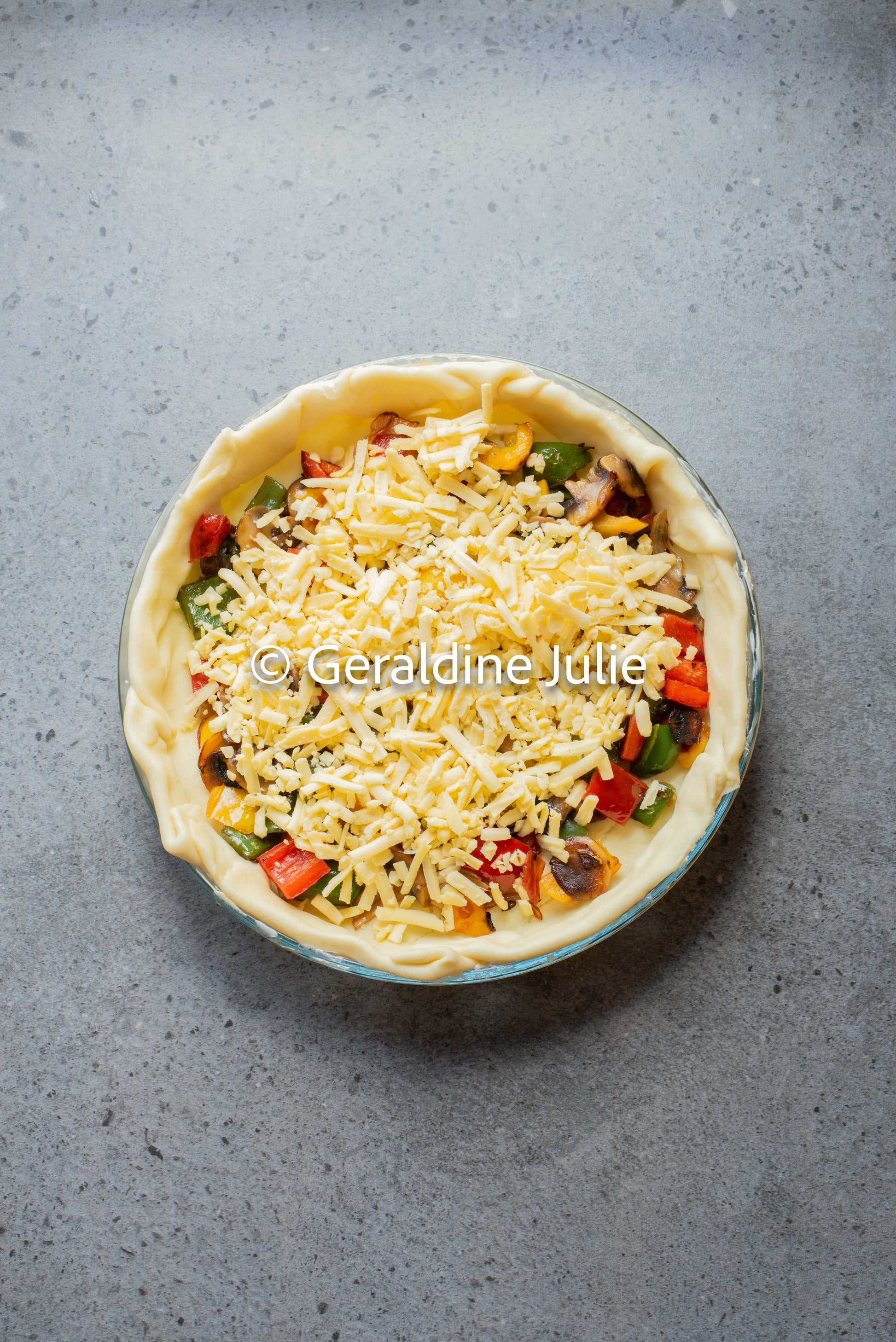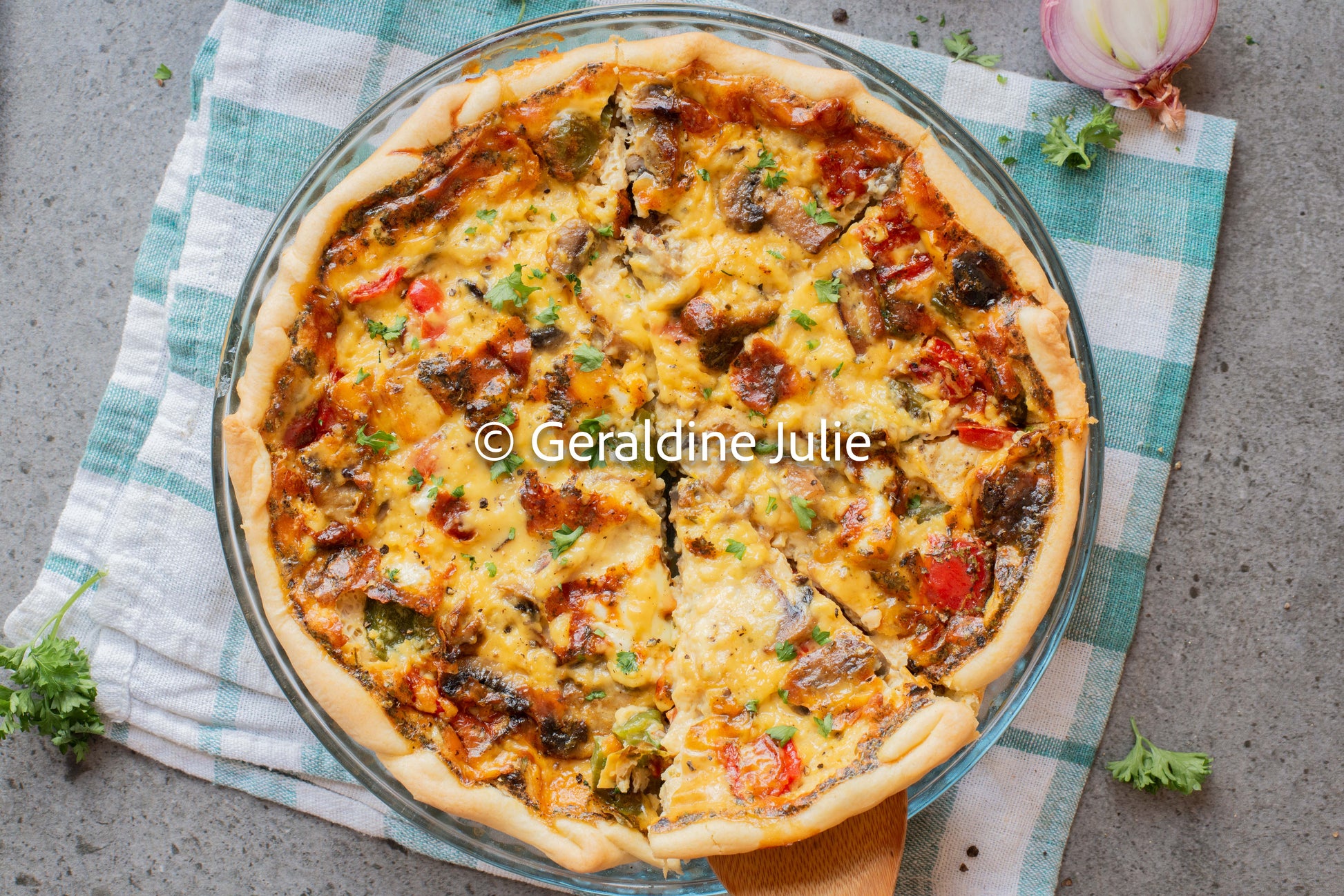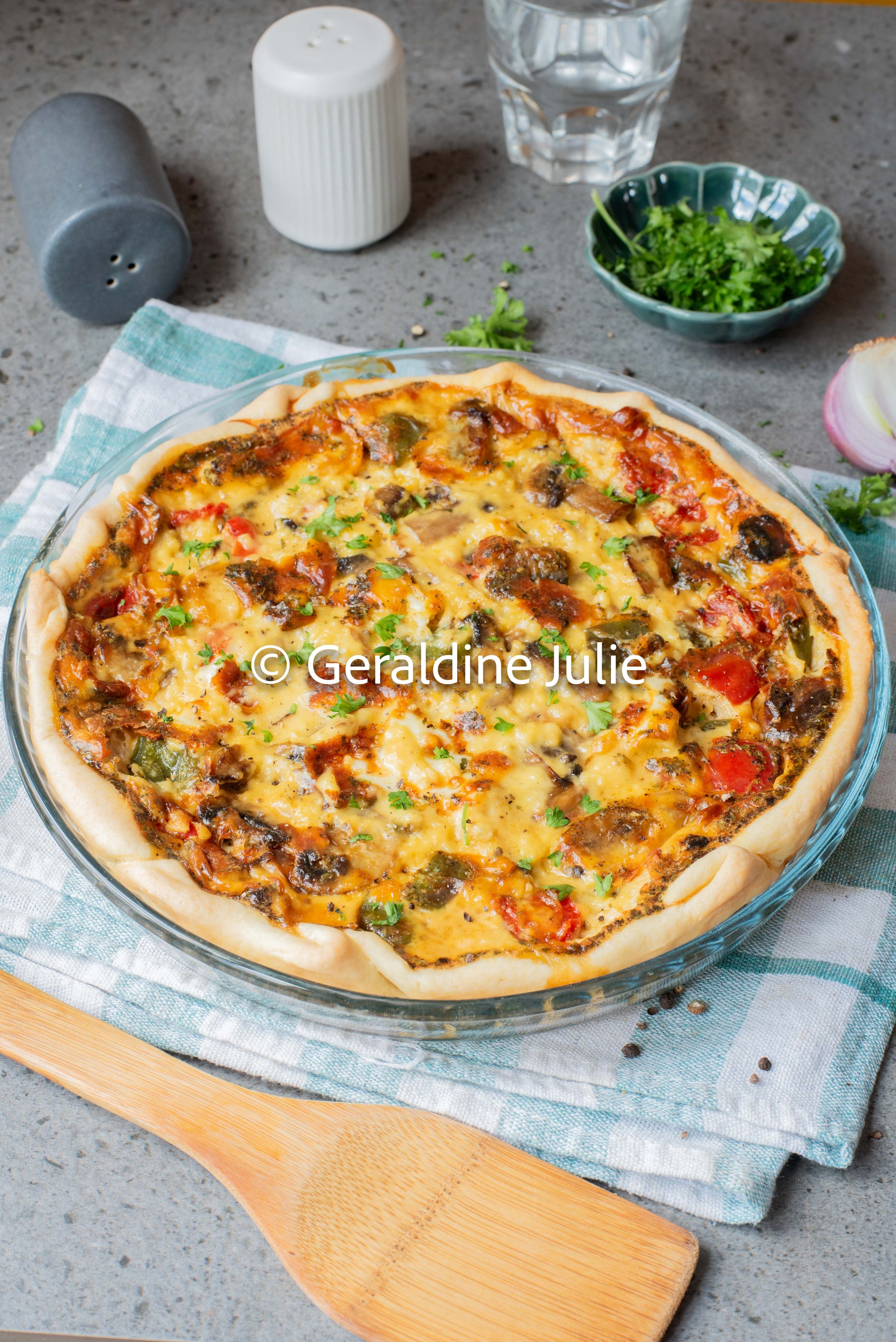🧄 Ingredients include: Pie crust, oil, mushrooms, bell pepper, onion, garlic, oregano, eggs, milk, cheese, salt, pepper.